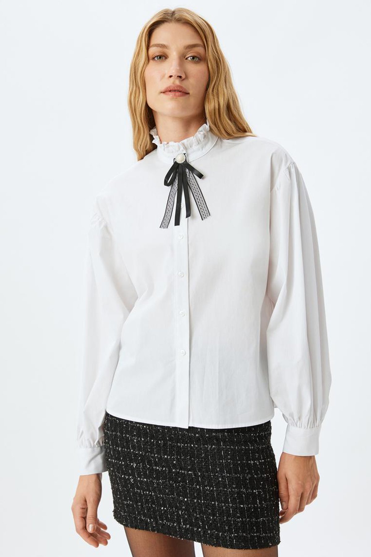 Koton X Sibil Çetinkaya - Pamuklu Uzun Kollu Fırfırlı Dik Yaka Fiyonk Detaylı Gömlek 5WAK60126EW
